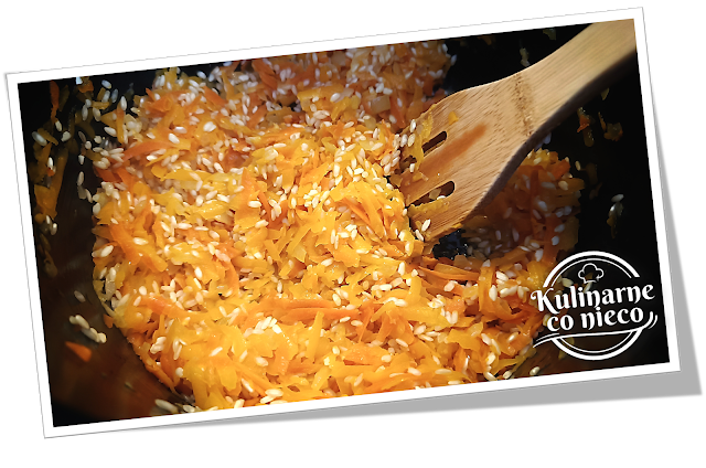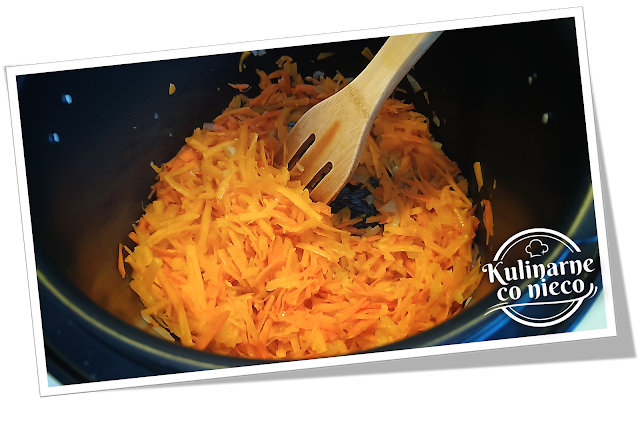 dodać startą marchewkę i dynię. Smażyć przez około 5 minut, aż dynia zacznie