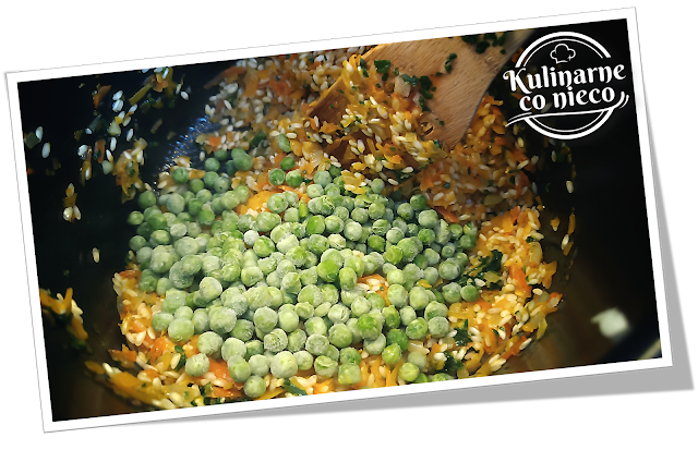 groszek i kukurydzę. Gotować dalej, mieszając i dodając więcej bulionu, aż ryż