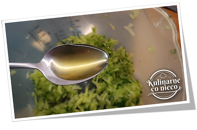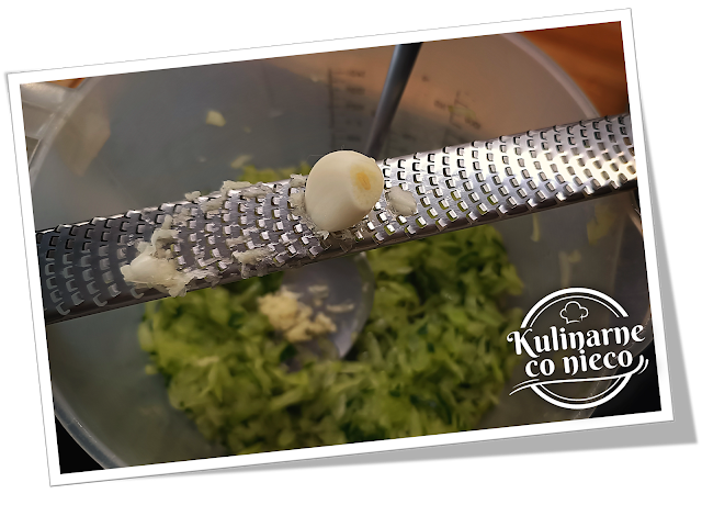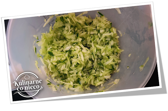 obrać i zetrzeć na tarce lub przecisnąć przez praskę. Dodać do miski z ogórkiem.