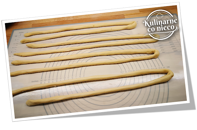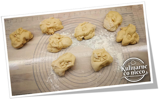 Wyrośnięte ciasto podzielić na 8 równych części (po ok 140 g każda).