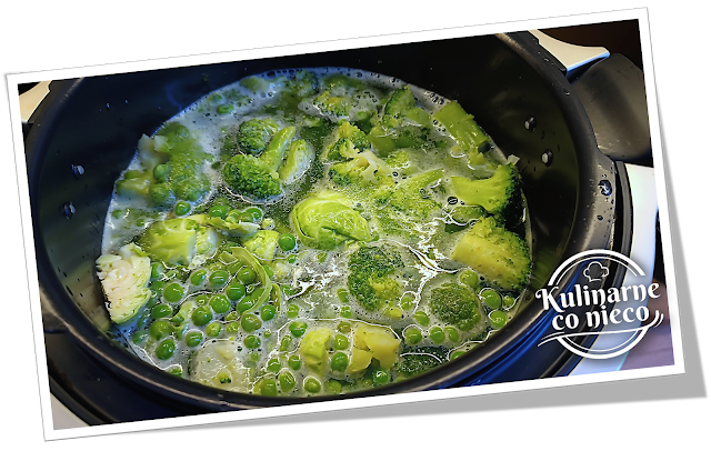 Dodać brukselkę, brokuły i zielony groszek.