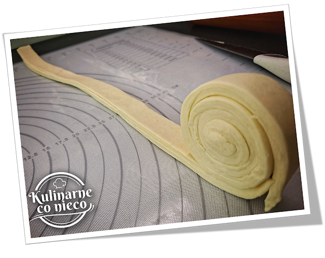 Ciasto rozwałkować na prostokąt o grubości ok 8 mm lub