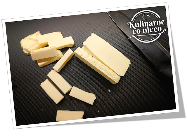 Ser Halloumi wyjąć z opakowania i osuszyć w papierowym ręczniku z solanki następnie pokroić w słupki o grubości ok 1 cm.