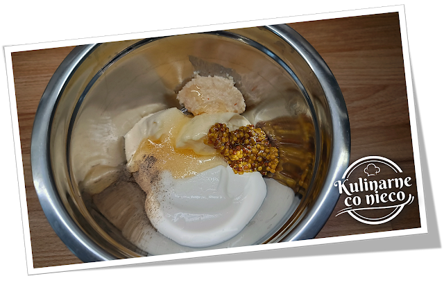 majonez, gęstą śmietanę, tarty chrzan, musztardę francuską, miód, ocet jabłkowy,