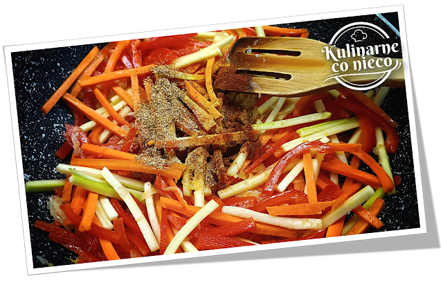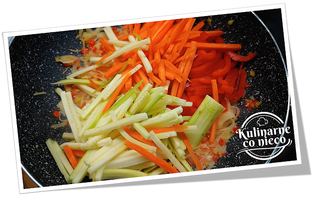 dorzucić pokrojona paprykę, marchewkę i cukinię. Posypać warzywa przygotowaną