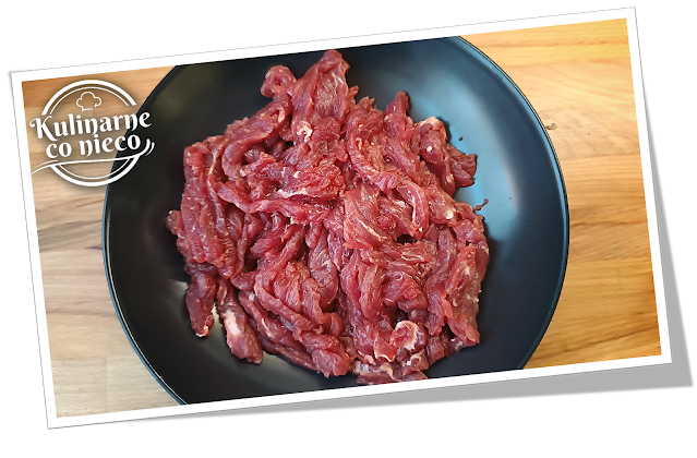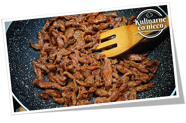 mieszać, aby paski mięsa równomiernie się obsmażyły. Gotowe mięso przełożyć na