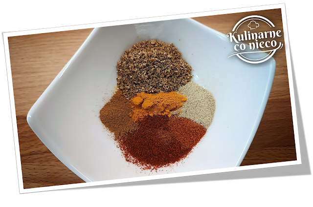 W małej miseczce wymieszać mieloną kolendrę, kurkumę, biały pieprz, paprykę słodką i ostrą oraz cynamon.