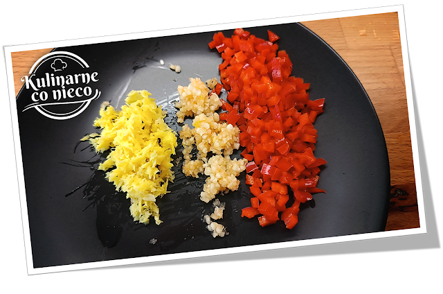 Dodać przeciśnięty przez praskę czosnek, starty imbir i posiekaną papryczkę