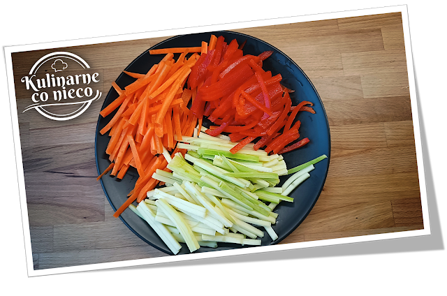 Marchewkę i cukinię pokroić w cienkie słupki.