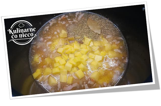 całości. Dodać również pokrojone w kostkę ziemniaki oraz ziele angielskie, liść laurowy, majeranek, sól i pieprz. Wymieszać.