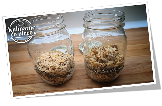 najmniej 500 ml wsypać płatki owsiane oraz nasiona Chia. Orzechy uprażyć na