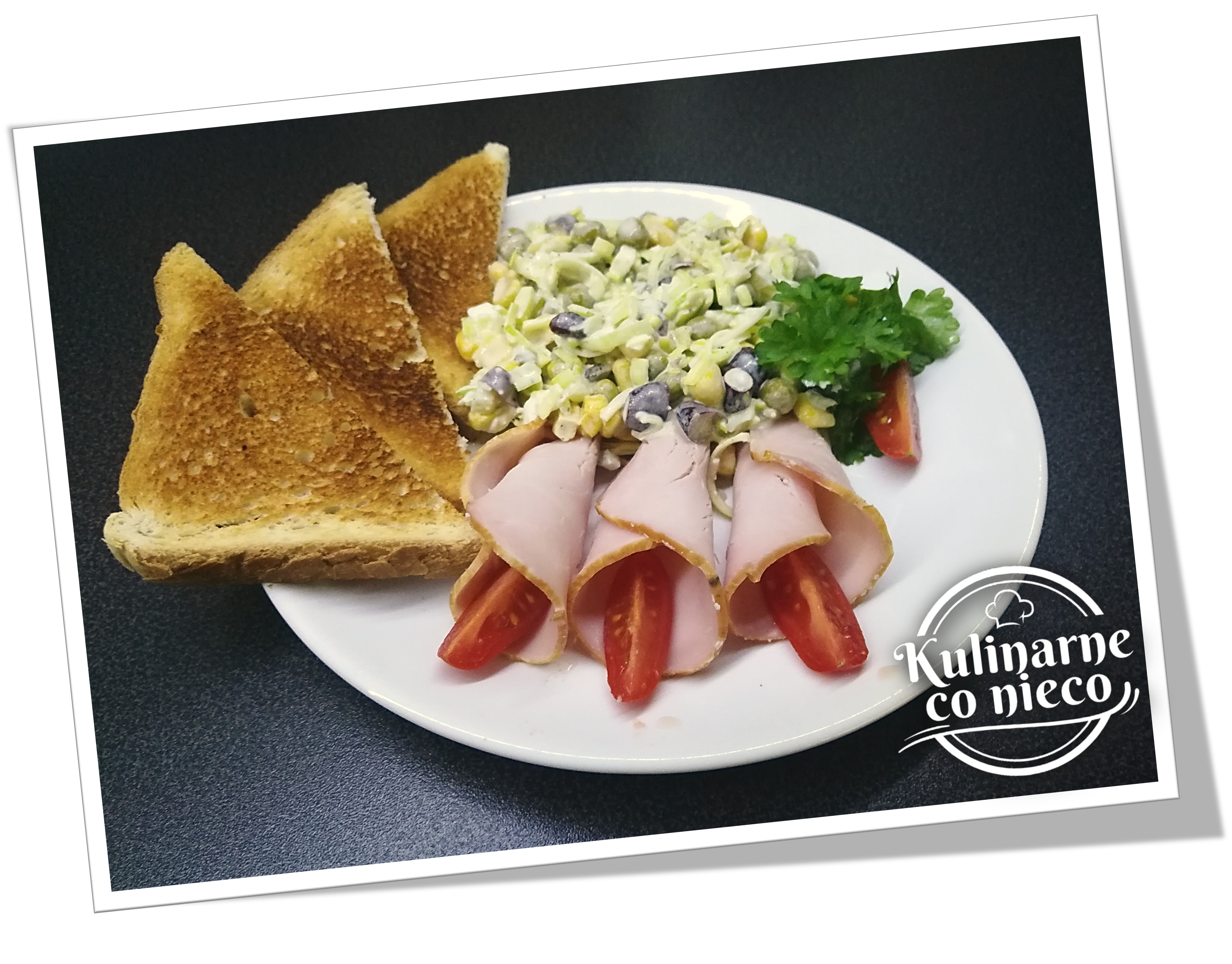 Sałatka jest gotowa do podania praktycznie od razu, ale najlepiej smakuje lekko schłodzona. Świetnie sprawdza się jako dodatek do mięs, wędlin czy grillowanych dań, ale równie dobrze można ją podać po prostu ze świeżym pieczywem i zrobić z niej szybki, konkretny posiłek. To taki typ sałatki, który znika ze stołu pierwszy a potem zawsze pada pytanie „a będzie jeszcze?”. 😄