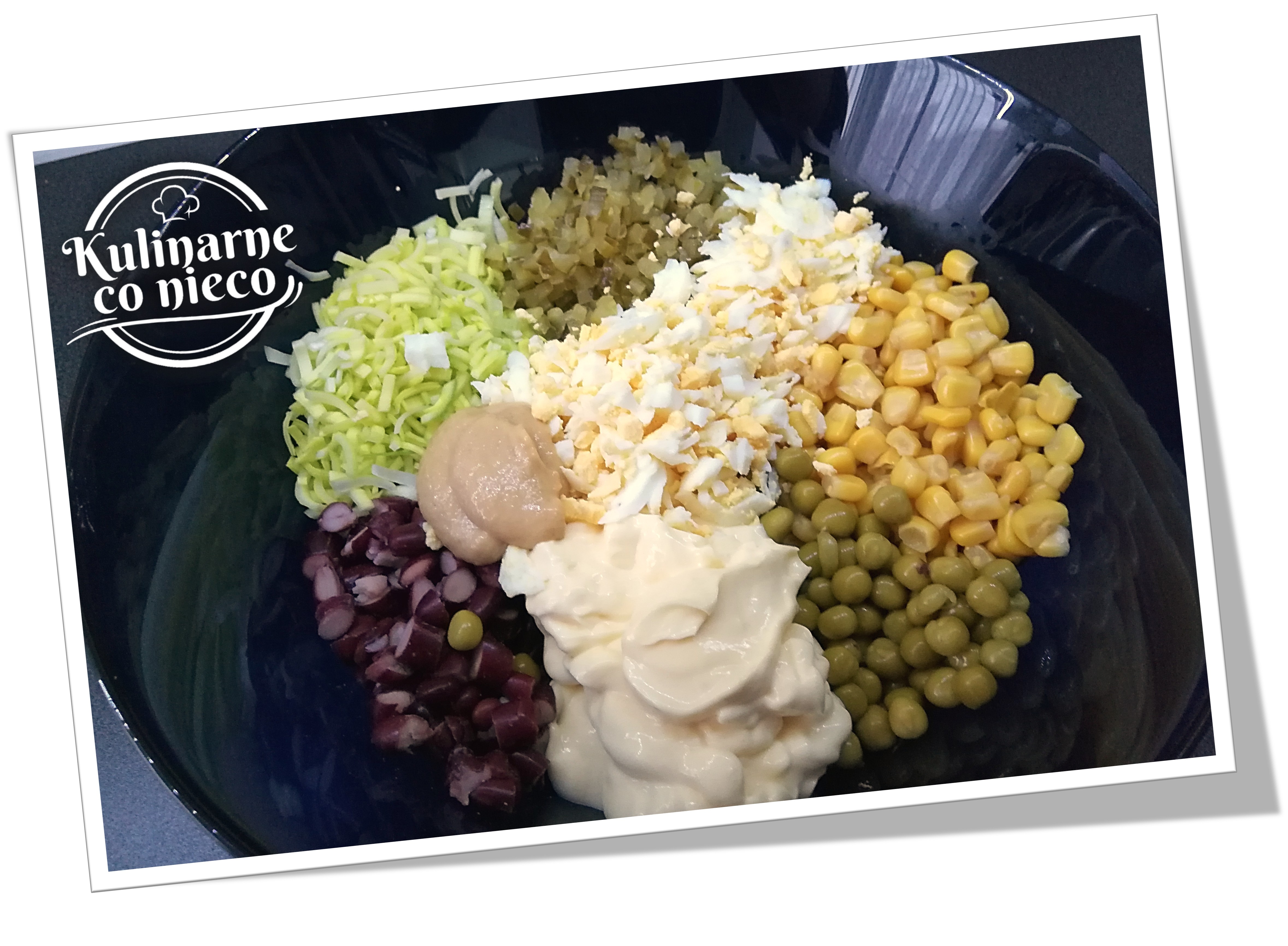 Całość delikatnie wymieszać, doprawić solą i świeżo mielonym pieprzem. Na tym etapie warto spróbować, bo ogórki i konserwy już wnoszą swoją słoność. Następnie dodać łyżkę musztardy chrzanowej, która lekko podkręci smak i nada charakteru. Na koniec dodać majonez – najlepiej stopniowo, mieszając, aż wszystkie składniki ładnie się połączą i sałatka uzyska kremową, ale nie ciężką konsystencję.