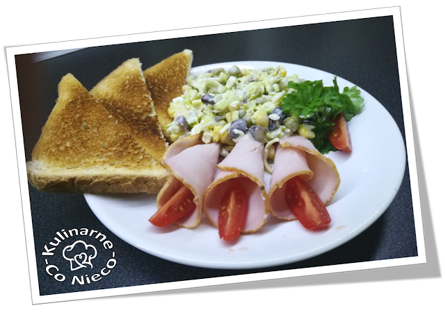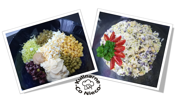 Jajka ugotować na twardo i odstawić do ostygnięcia. W porach odciąć zieloną część a białą umyć. Pora przeciąć na pół wzdłuż a następnie każdą połówkę na kolejne trzy części (wzdłuż). Pokroić w cienkie plasterki (tak postąpić z resztą porów). Umieścić w dużej misce. Kukurydzę, groszek i fasole odsączyć na sitku i dodać do miski z posiekanym porem, (jeśli mamy trochę więcej czasu i ochoty czerwoną fasolę można również pokroić na mniejsze cząstki). Jaja zetrzeć na tarce na grubych oczkach a ogórki pokroić w małą kostkę i dodać do reszty składników. Wszystko doprawić solą i pieprzem. Na koniec dodać łyżkę musztardy i majonez w ilości która spowoduje, że wszystkie składniki dokładnie się połączą. Sałatka nadaje się już tylko do jedzenia. Można podawać ją ze świeżym pieczywem, wędliną lub mięsem jako dodatek. Zapewniam, że wszyscy, którzy będą mieli okazję spróbować tej sałatki będą nią zachwyceni.
