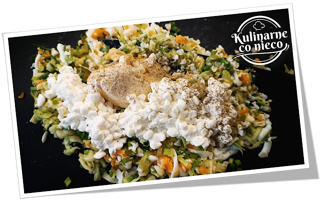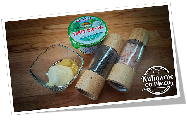 Następnie dodać serek wiejski, majonez oraz musztardę Dijon. Całość doprawić solą i pieprzem według uznania. Ponownie przesiekać