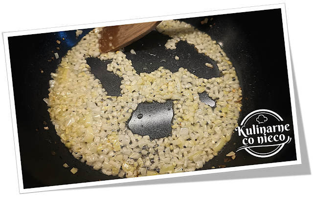 Na dużej patelni rozgrzać olej. Dodać posiekaną cebulę