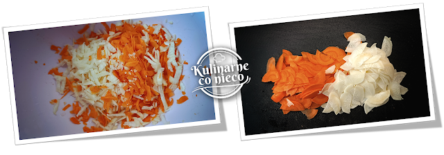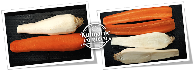 (marchew, pietruszka) obrać i podzielić na dwie równe części.