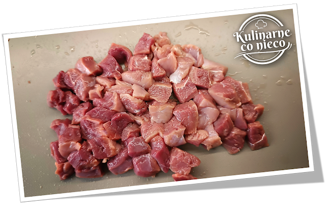 oczyścić z nadmiaru tłuszczu i zdjąć skórę (zachować ją do wytopienia tłuszczu). Mięso pokroić w większą kostkę.