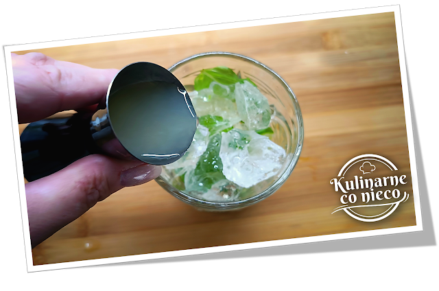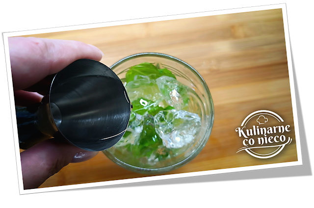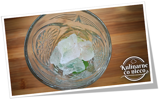 szklance typu highball lub szerokim tumblerze umieścić kilka listków mięty – najlepiej wybrać młode, jędrne liście z wierzchołka gałązki,