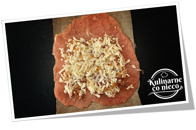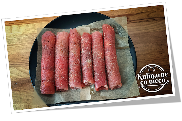 każdym rozbitym kawałku mięsa ułożyć porcję farszu i zwinąć w ciasną w roladkę.