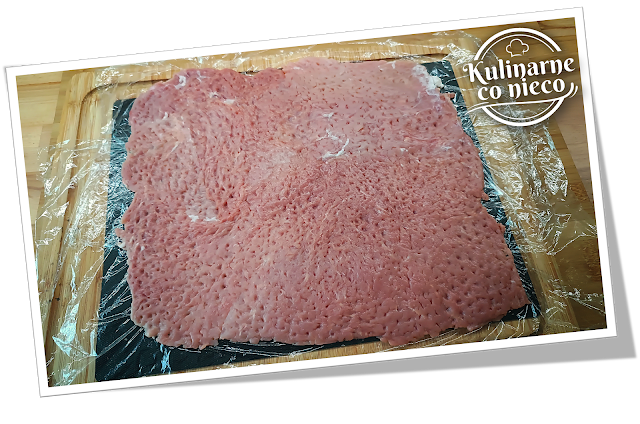 płat mięsa przykryć arkuszem folii spożywczej lub pergaminu i delikatnie rozbić