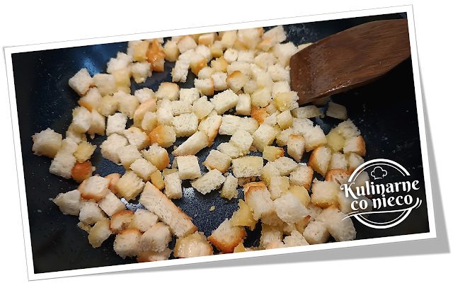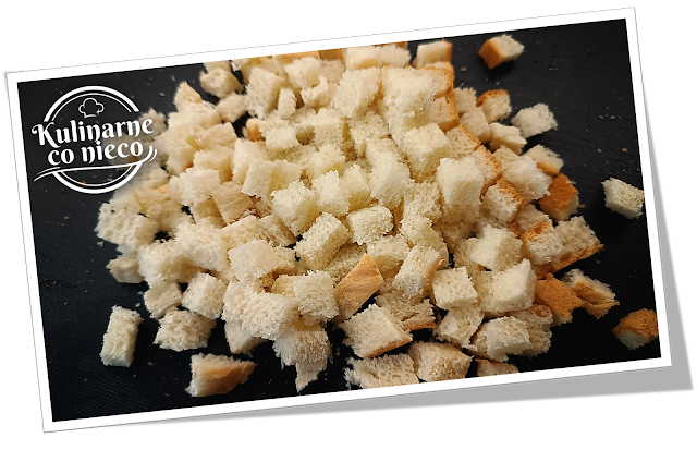 pieczywa pokroić w niewielką kostkę o boku około 1½ cm.