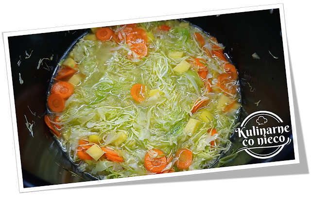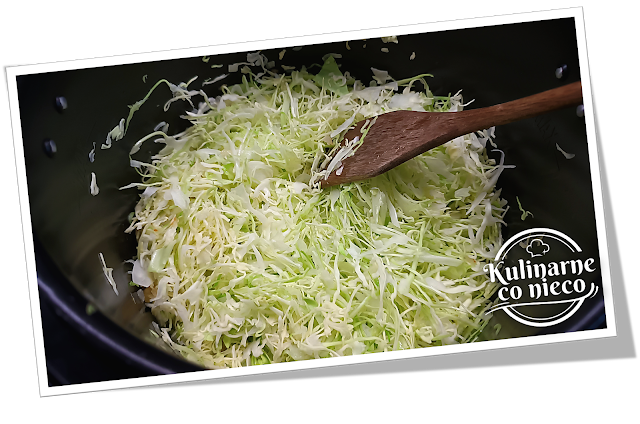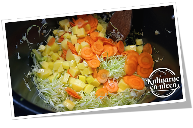 cebuli i czosnku dodać pokrojoną kapustę, ziemniaki oraz marchew.