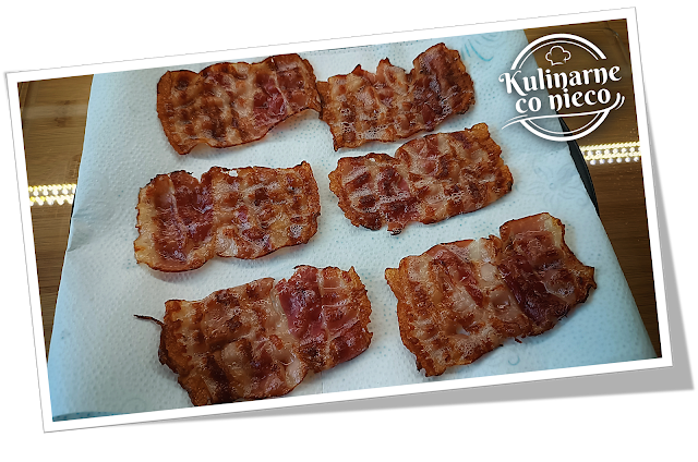 blachę wyłożoną papierem do pieczenia. Rozłożyć na niej plastry boczku, tak aby