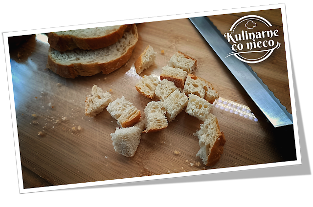 Pokrojone kawałki bułki umieścić w pojemniku i zalać