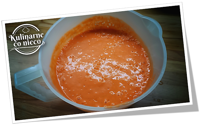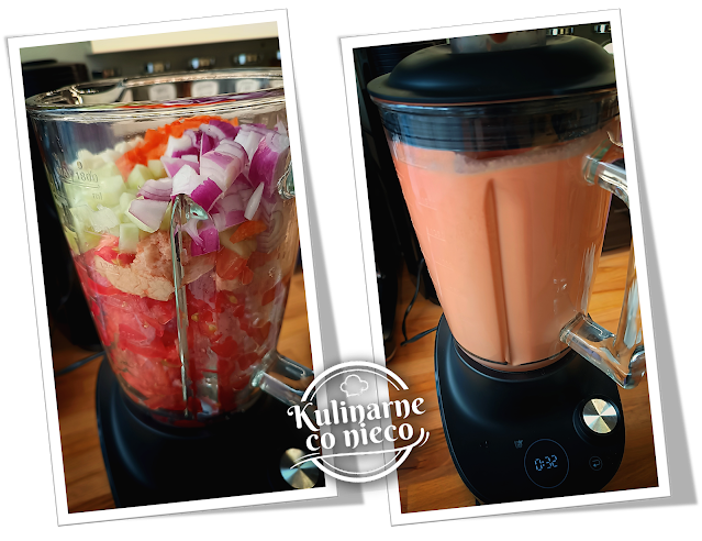 paprykę, ogórka, cebulę, czosnek – przełożyć do kielicha blendera. Dodać