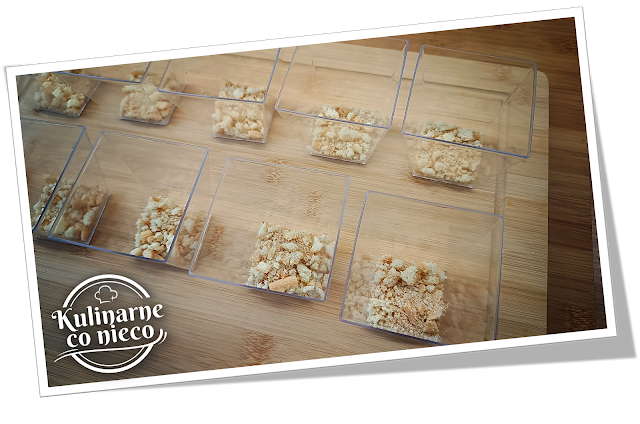 Na dnie każdego serniczka spoczywa warstwa pokruszonych biszkoptów, które