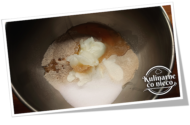 pełnoziarnistą, mąkę pszenną, proszek do pieczenia, sól i erytrytol. Dodać Skyr,