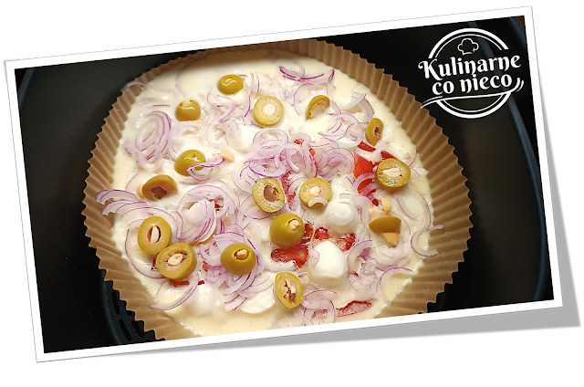 wierzchu ułożyć plasterki pomidora, mini mozzarellę, cebulę i plasterki oliwek.