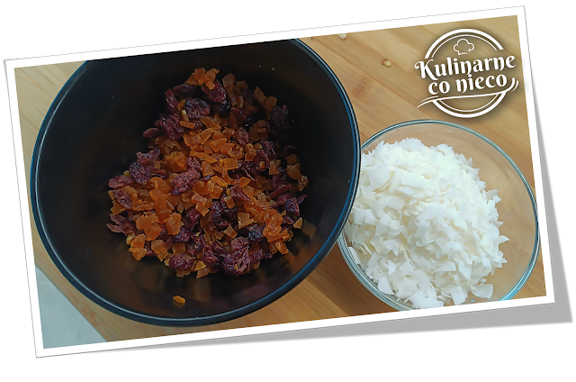 mieszanki wsypać posiekane chipsy kokosowe, a także żurawinę – bogatą w