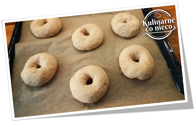 Uformowane bajgle przełożyć na blachę wyłożoną papierem do pieczenia, przykryć ściereczką i odstawić na około 20 minut, aby ciasto lekko napęczniało przed obgotowaniem.