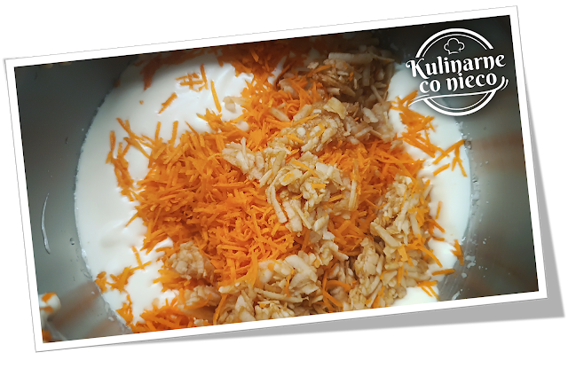 Do mokrej masy wsypać startą marchew oraz