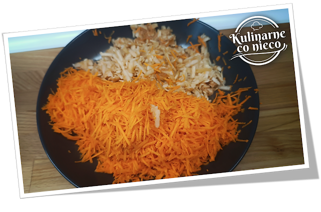 Marchew zetrzeć na drobnych oczkach tarki a jabłko na grubych. Starte jabłko delikatnie