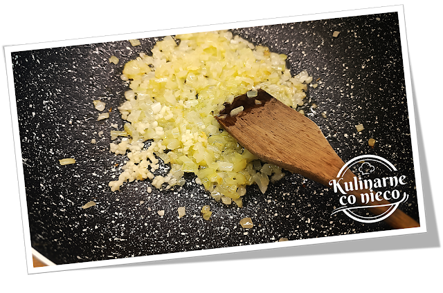 rozgrzać oliwę. Wrzucić posiekaną cebulę i czosnek, zeszklić przez 3 minuty,