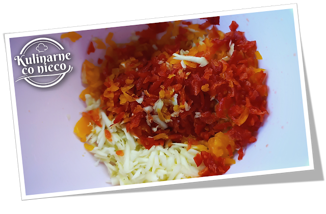 wydrążyć gniazda nasienne wraz z białymi włóknami. Oczyszczone papryki również zetrzeć na tarce jarzynowej o grubych oczkach.