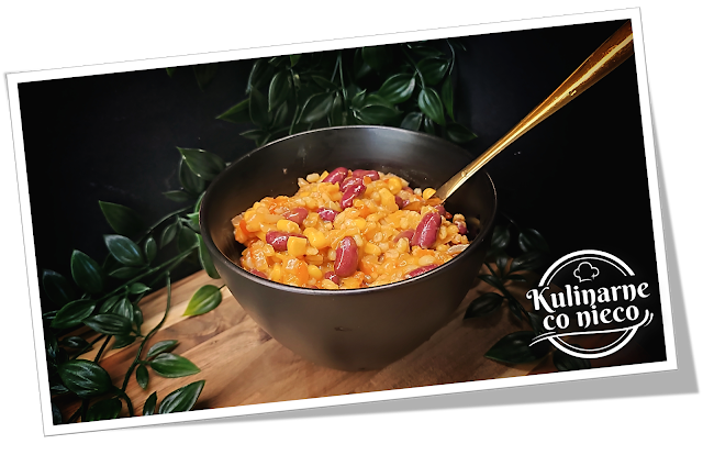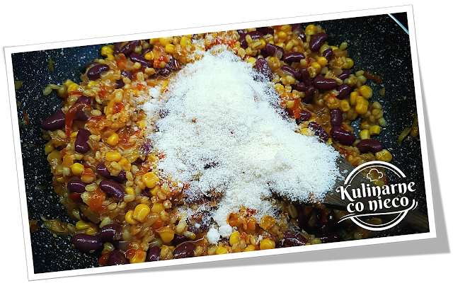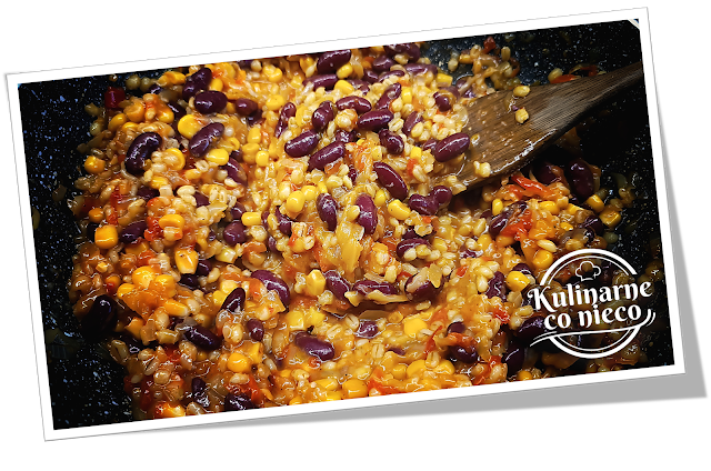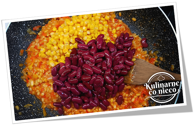 dołącza ugotowany pęczak, fasola i kukurydza, całość zamienia się w kolorową,