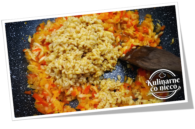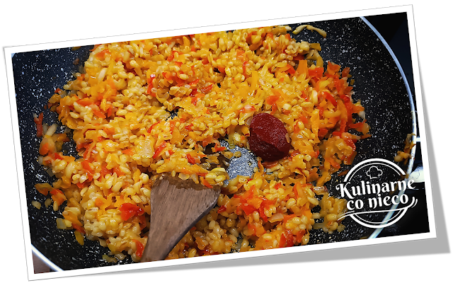 Dodać ugotowaną kaszę pęczak oraz łyżeczkę koncentratu pomidorowego i dokładnie