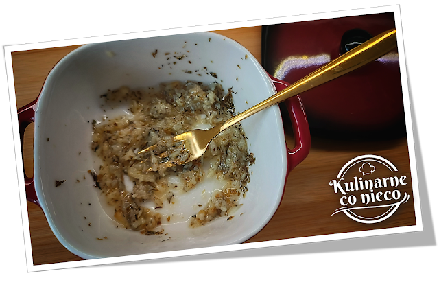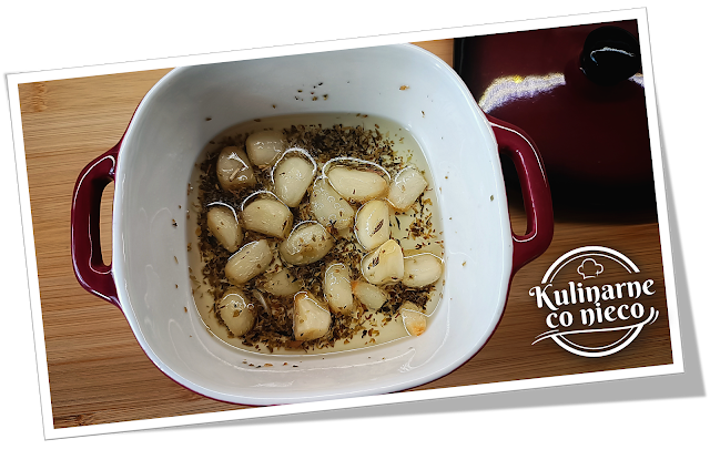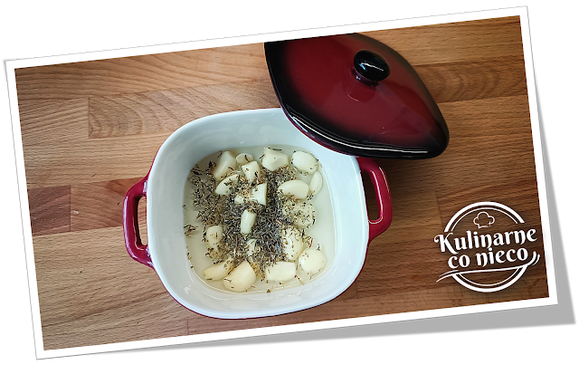 wystudzenia – po tym czasie odcedzić całość przez sitko z nadmiaru oliwy. Upieczony czosnek