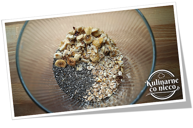 wsypać płatki orkiszowe, posiekane orzechy laskowe i nasiona chia, które po