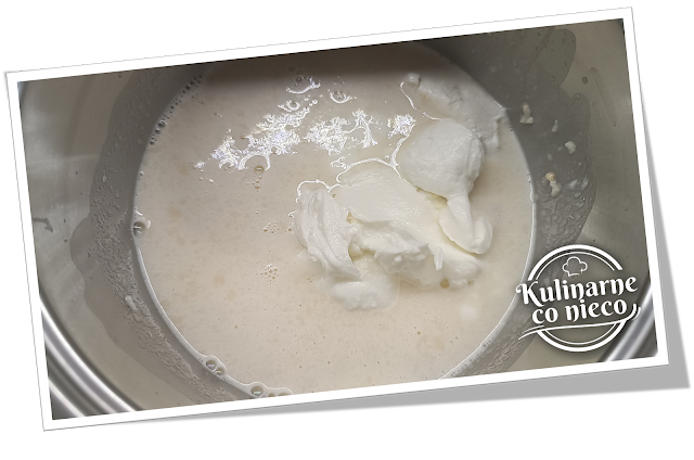 podgrzać do ok 40°C, aby krem mógł zmięknąć łatwiej połączyć się z mlekiem. Następnie