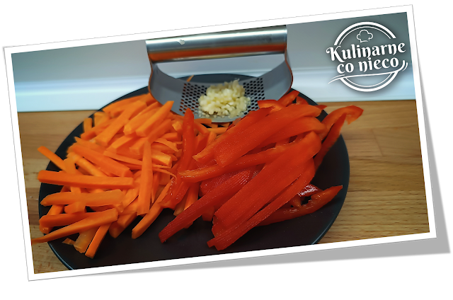 słupki a paprykę oczyścić z gniazda nasiennego i pokroić w cienkie paski.