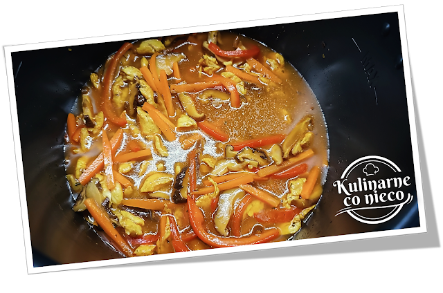 marchew, paprykę i grzyby shiitake, a następnie całość zalać bulionem i sosem