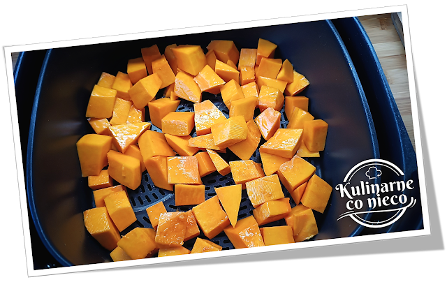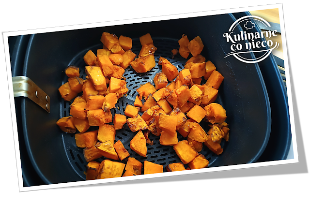 Dynię można także upiec w AirFryerze, ustawiając temperaturę na 180°C i piekąc przez około dwadzieścia minut. W połowie czasu warto delikatnie potrząsnąć koszykiem, aby kawałki równomiernie się przyrumieniły.