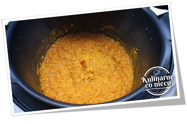 Następnie wlać bulion wymieszany z dyniowym puree. Wszystko starannie wymieszać silikonową szpatułką, tak aby żadne ziarna nie przywarły do dna garnka. Zamknąć pokrywę i ustawić program ,,GOTOWANIE POD CIŚCIENIEM – WYSOKIE ĆIŚNIENIE” na 9 minut.