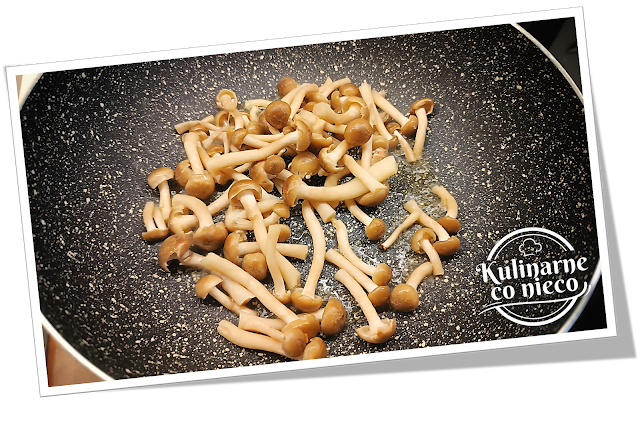 Gdy ryż się gotuje, można równolegle przygotować grzybki shimeji na patelni. Na odrobinie masła klarowanego podsmażyć je przez 6 minut, aż zmiękną i lekko się zarumienią. Doprawić solą, pieprzem. Grzybki powinny pozostać jędrne i soczyste.