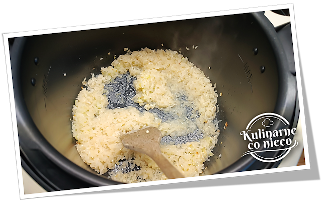 Do zeszklonej warzyw wsypać 200 g wypłukanego i odsączonego ryżu, wymieszać i podsmażać przez około 1 minutę, aby ziarna lekko się opiekły i stały błyszczące. Dzięki temu ryż zachowa sprężystość a risotto będzie miało głęboki, lekko orzechowy posmak.